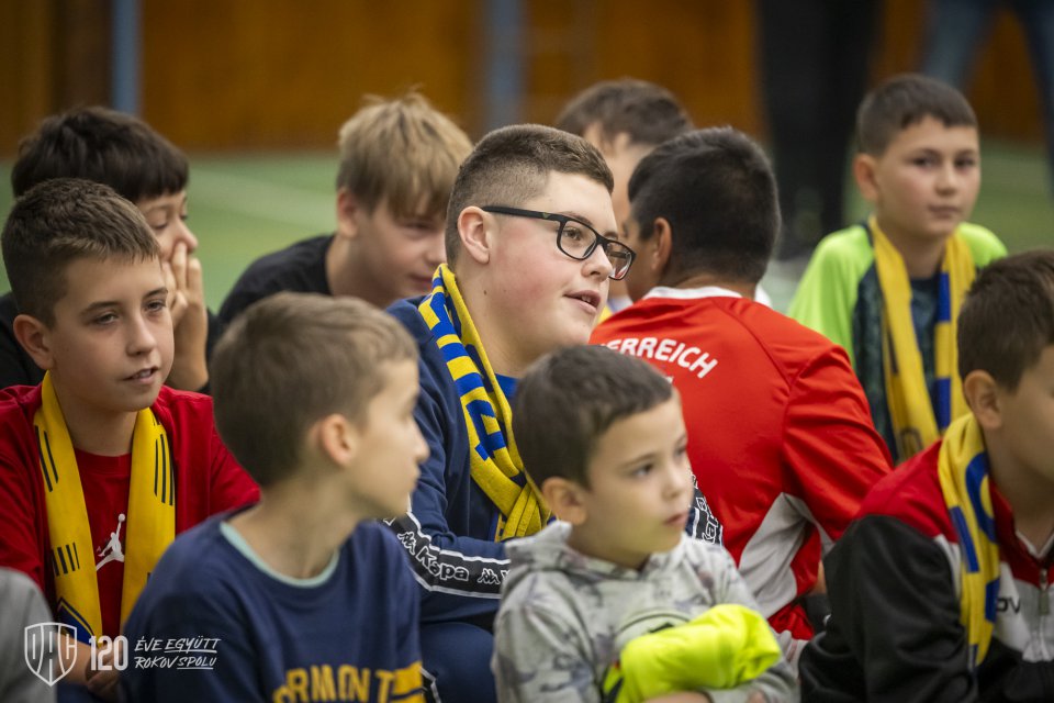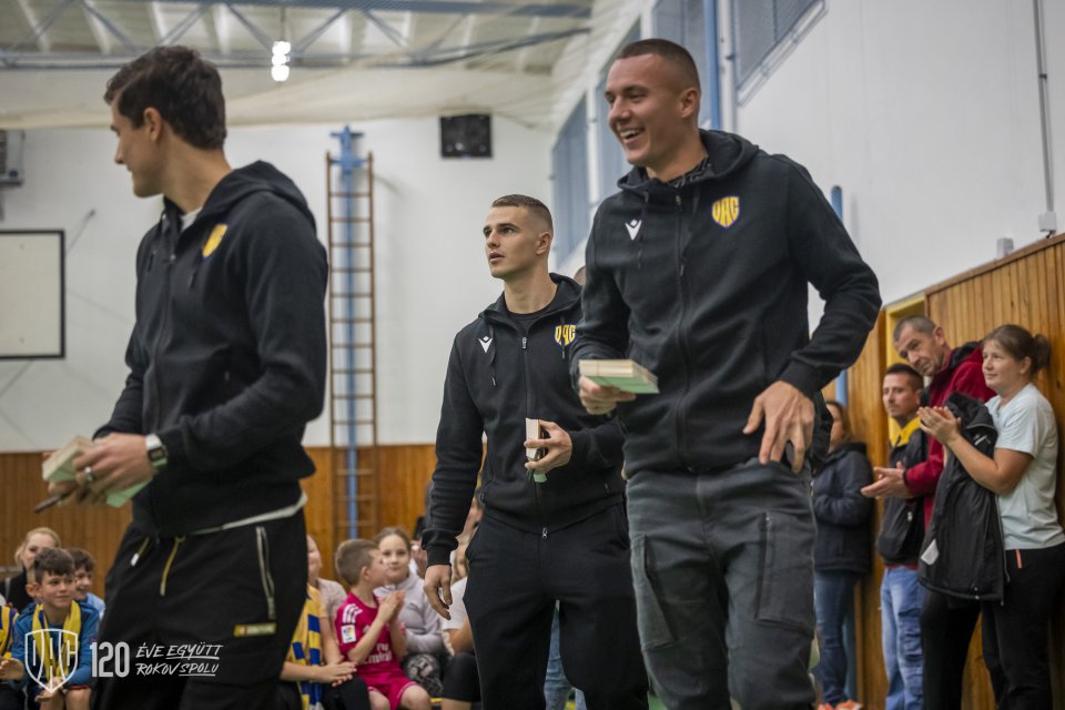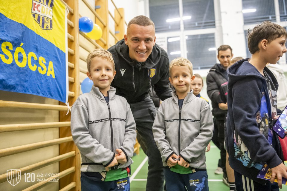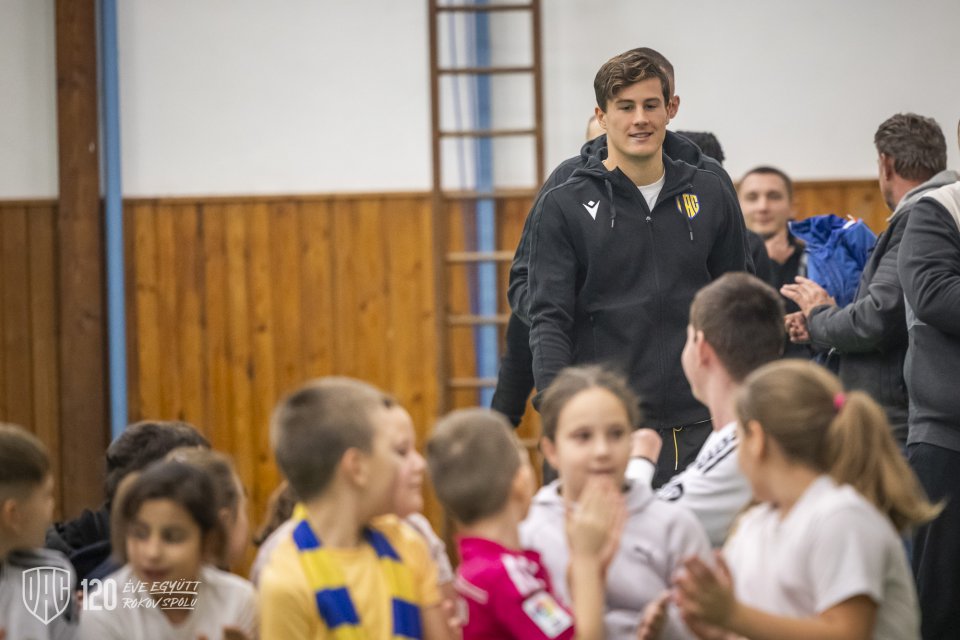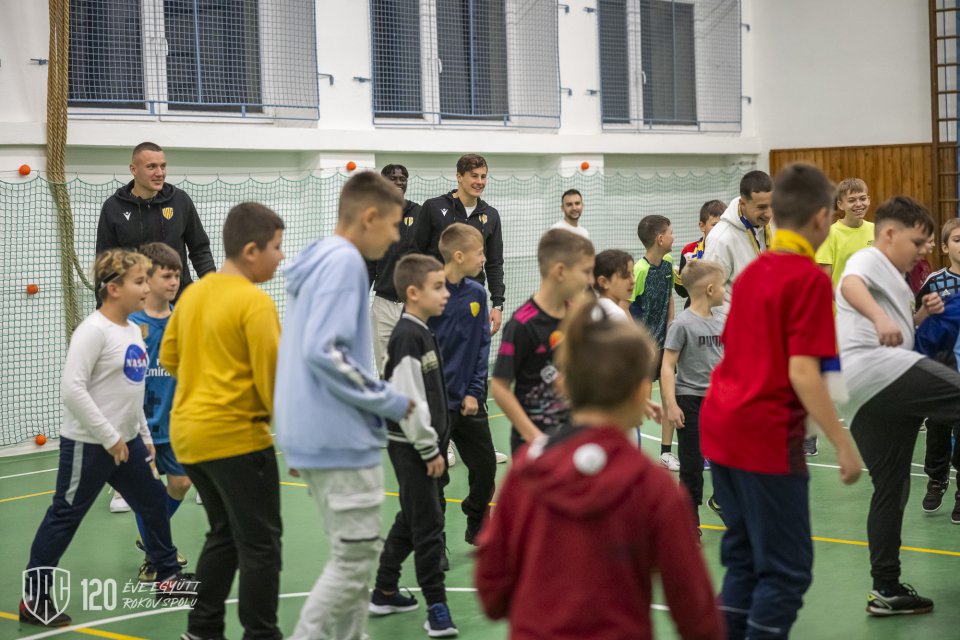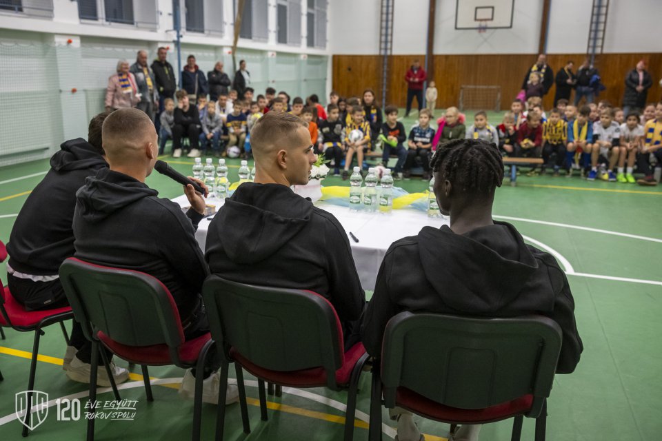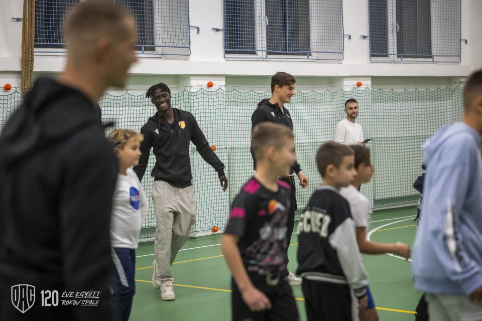 Projekt Poďme spolu na DAC! pokračoval vo štvrtok poobede návštevou štvorice Máté Tuboly, Ladislav Almási, Konrad Gruszkowski a Mahmudu Bajo u mladých futbalistov FC Zemianska Olča. Autor: Lelkes Ernő.