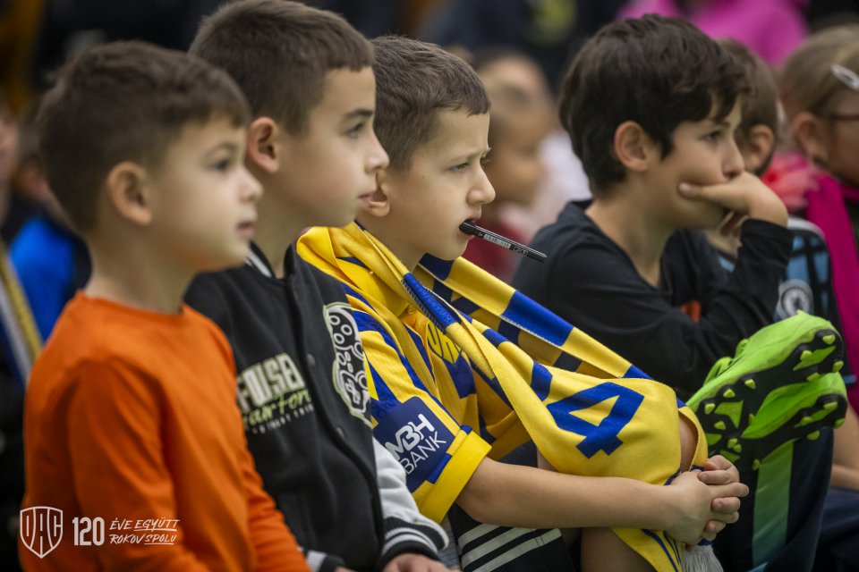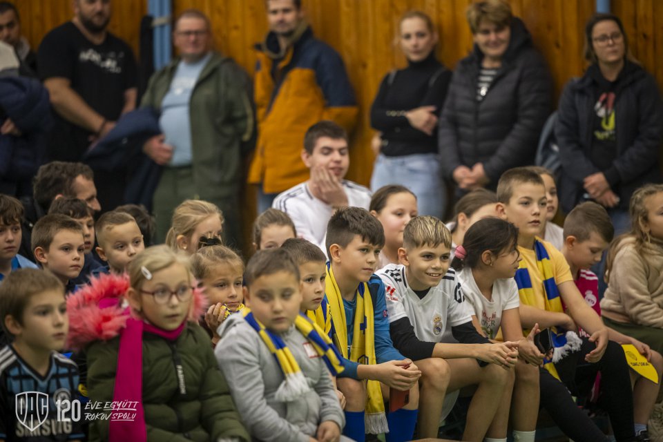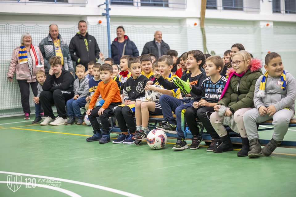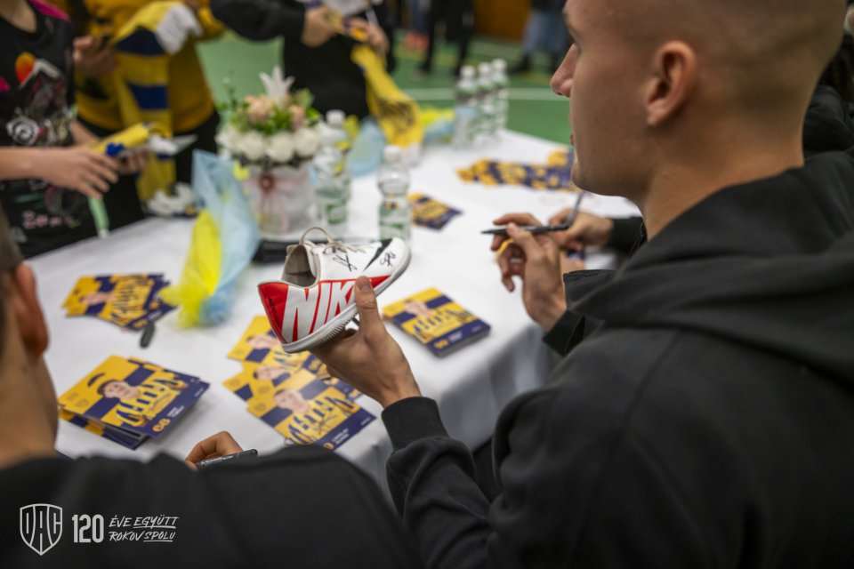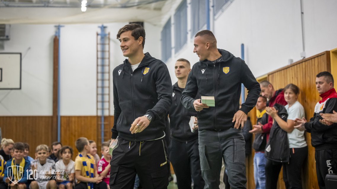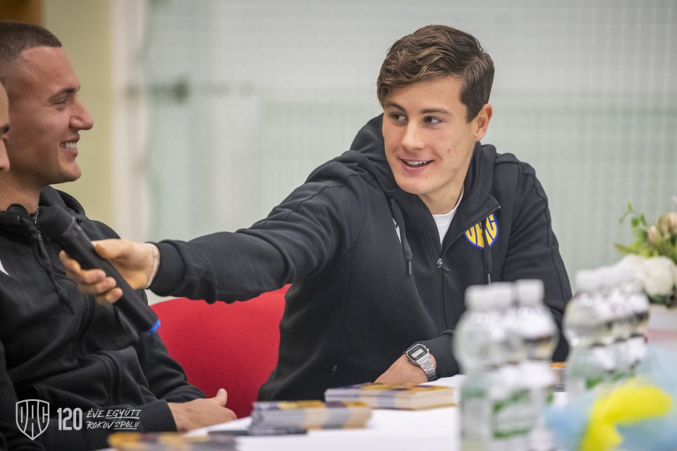 Projekt Poďme spolu na DAC! pokračoval vo štvrtok poobede návštevou štvorice Máté Tuboly, Ladislav Almási, Konrad Gruszkowski a Mahmudu Bajo u mladých futbalistov FC Zemianska Olča. Autor: Lelkes Ernő.