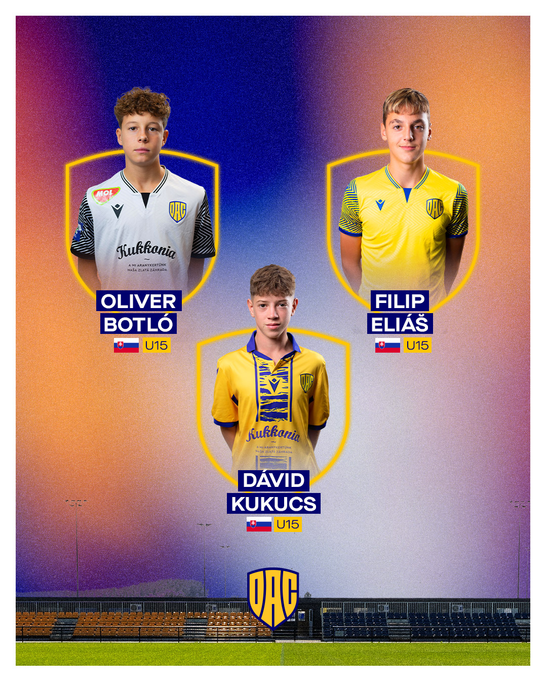 A DAC akadémiájáról három fiatal tehetség is meghívót kapott a szlovák U15-ös válogatottba, amely október 15. és 22. között Bulgáriában vesz részt az UEFA Development tornán. A keretben klubunkat Botló Oliver, Eliá Filip és Kukucs Dávid képviseli.