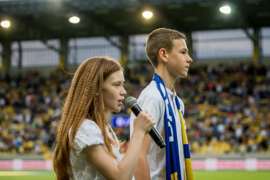 Már a kezdő sípszó előtt görögtüzek gyúlnak a B-középben, közben a játékosok is felsorakoznak a kezdéshez. A vendégek fehér szerelésben, mi a szokásos sárga-kékben.