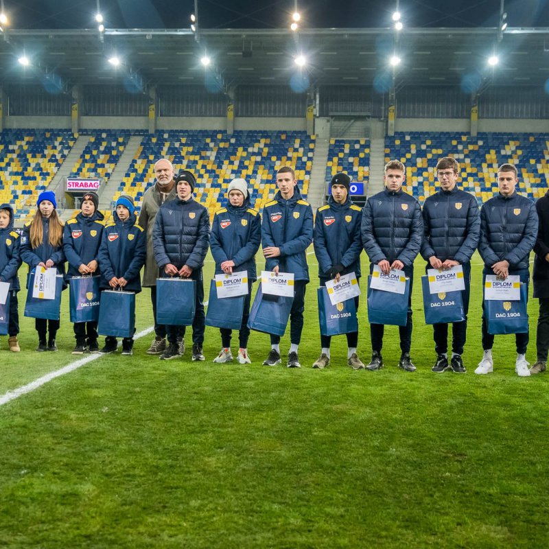 Jednou z tradícií Žlto-modrých Vianoc je aj ocenenie najlepších hráčov jednotlivých kategórií MOL Akadémie. V polčase piatkového zápasu DAC-Ružomberok si diplomy a darčekové predmety z rúk majiteľa klubu Oszkára Világiho a športového riaditeľa Jana Van Daeleho prevzali: