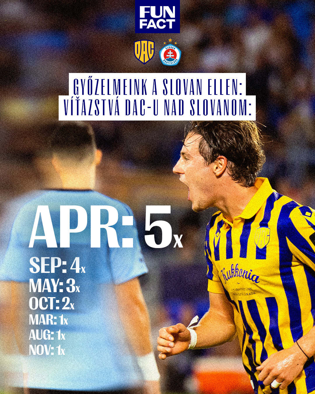 Zaujímavosťou je, že zo 17 víťazstiev nad Slovanom sa až 5 zrodilo v apríli, vďaka čomu je práve štvrtý mesiac v roku náš najúspešnejší proti tomuto rivalovi.