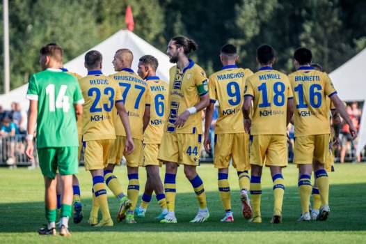 Práve prichádzajú aktéri oboch celkov na ihrisko. Domáci v zelených dresoch a naši hráči v tradičnej žlto-modrej kombinácii. Poďme si teda užiť dnešný sviatočný zápas, ale hlavne poďme si po postup. DAC do toho!