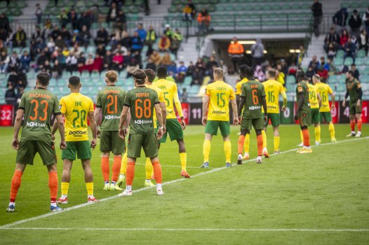 Domáci v žlto-zelených dresoch a naši hráči v tmavozelenom prevedení už sú nastúpení na ihrisku. Pomaly sa začína ďalší zaujímavý boj, v ktorom chceme zvíťaziť. DAC do toho!